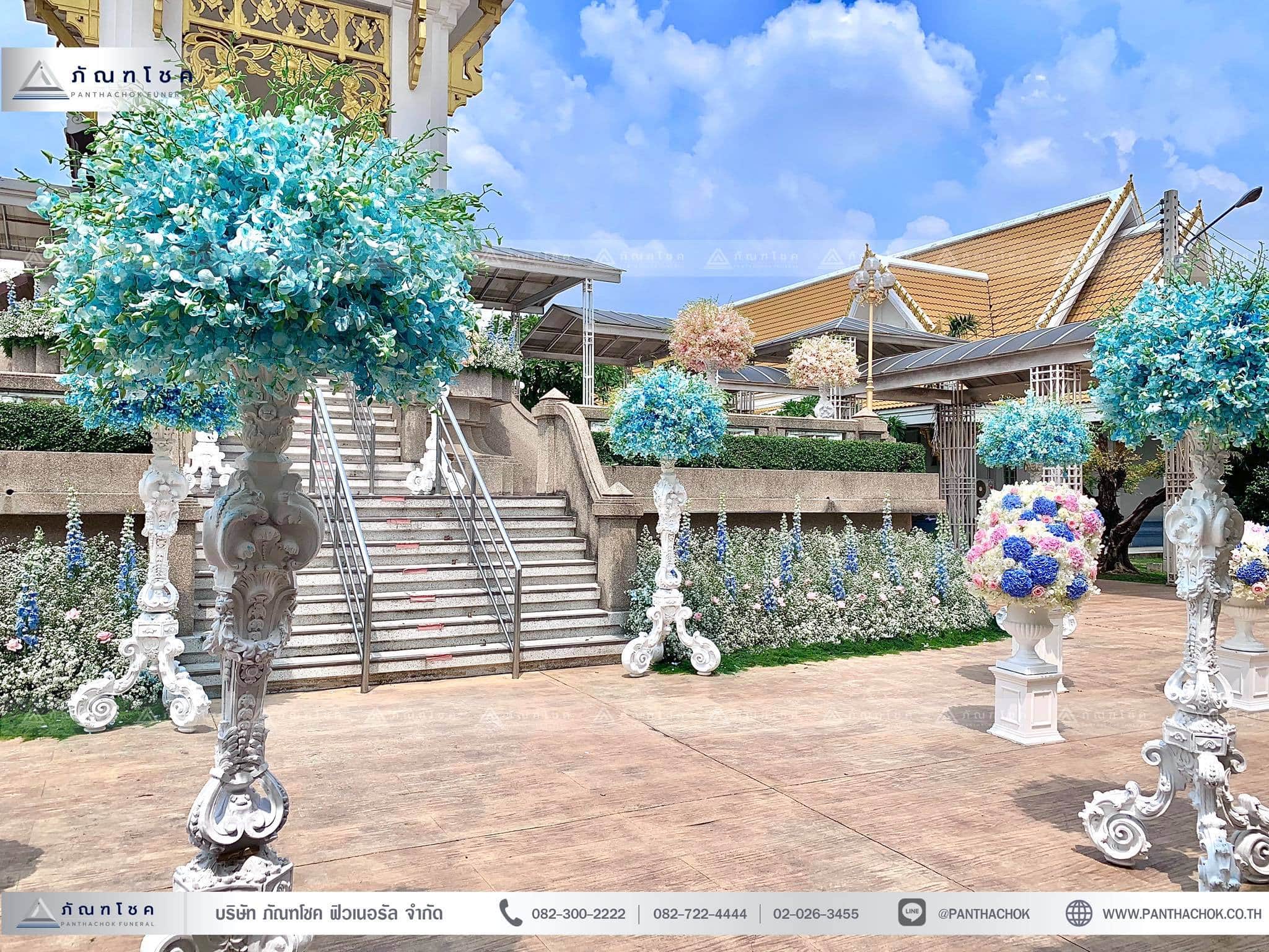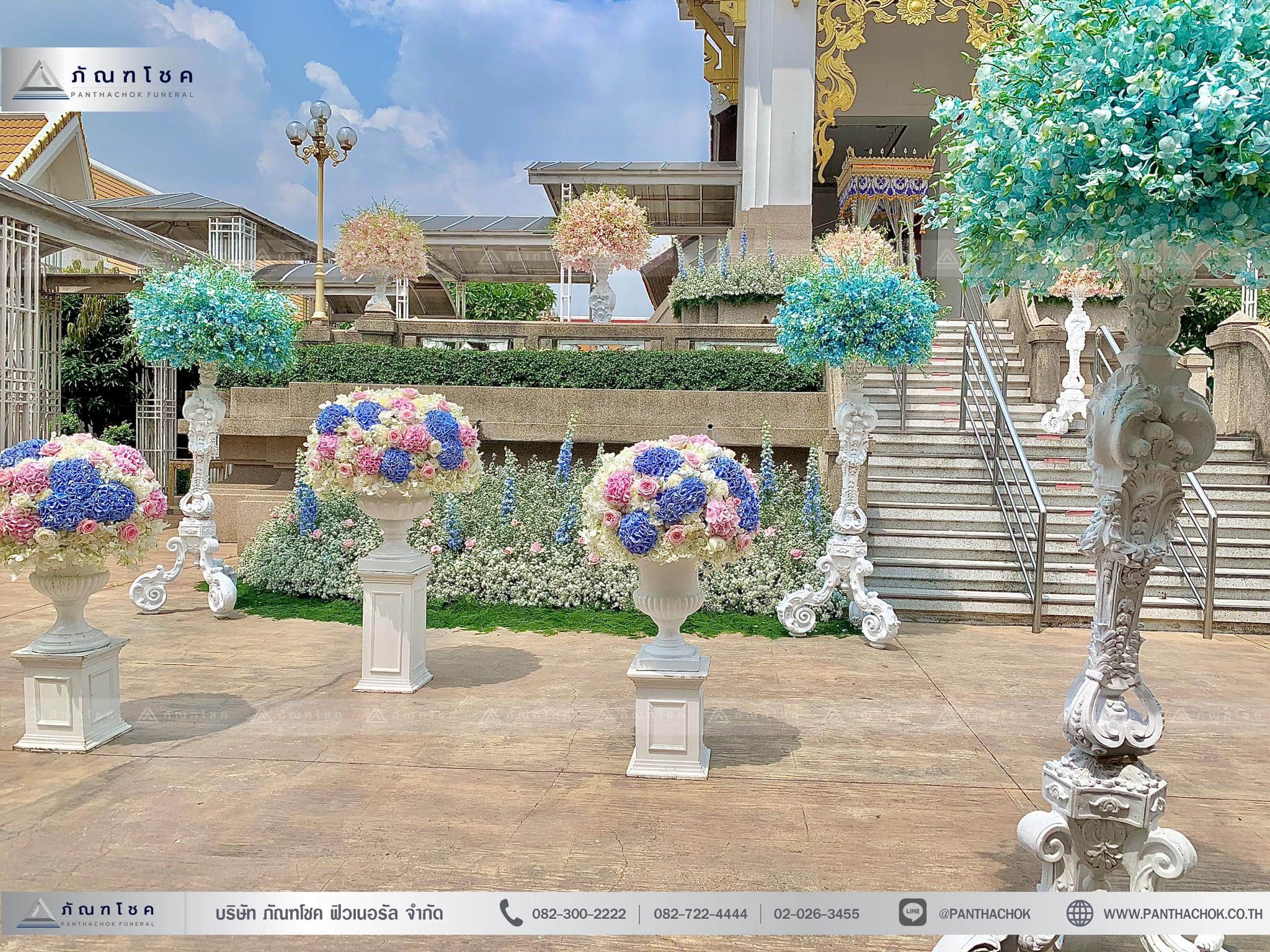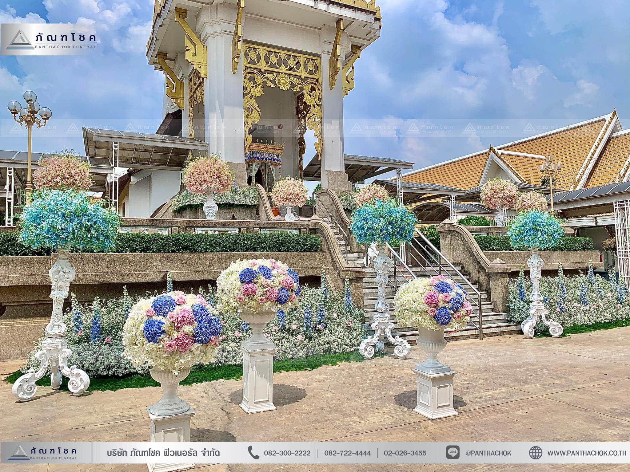 ดอกไม้หน้าเมรุหลากหลายสี ทำให้รู้สึกถึงความหรูหรา ในรูปแบบพุ่มดอกไม้ ที่ล้อมรอบเมรุที่สวยงาม