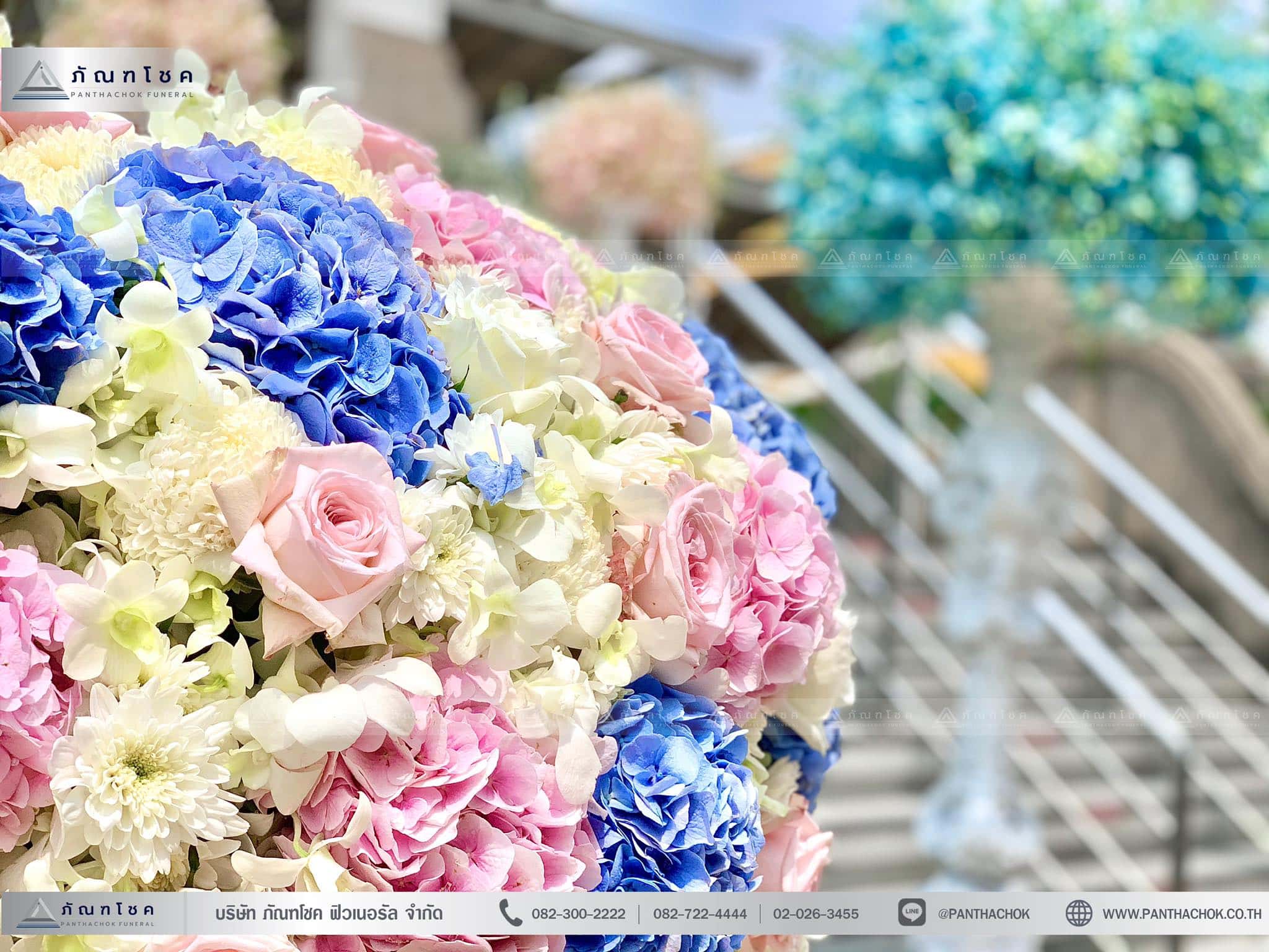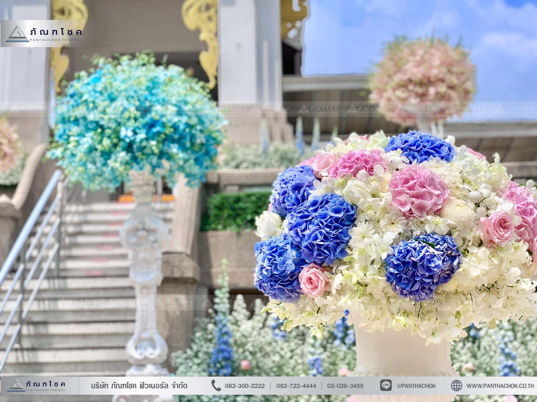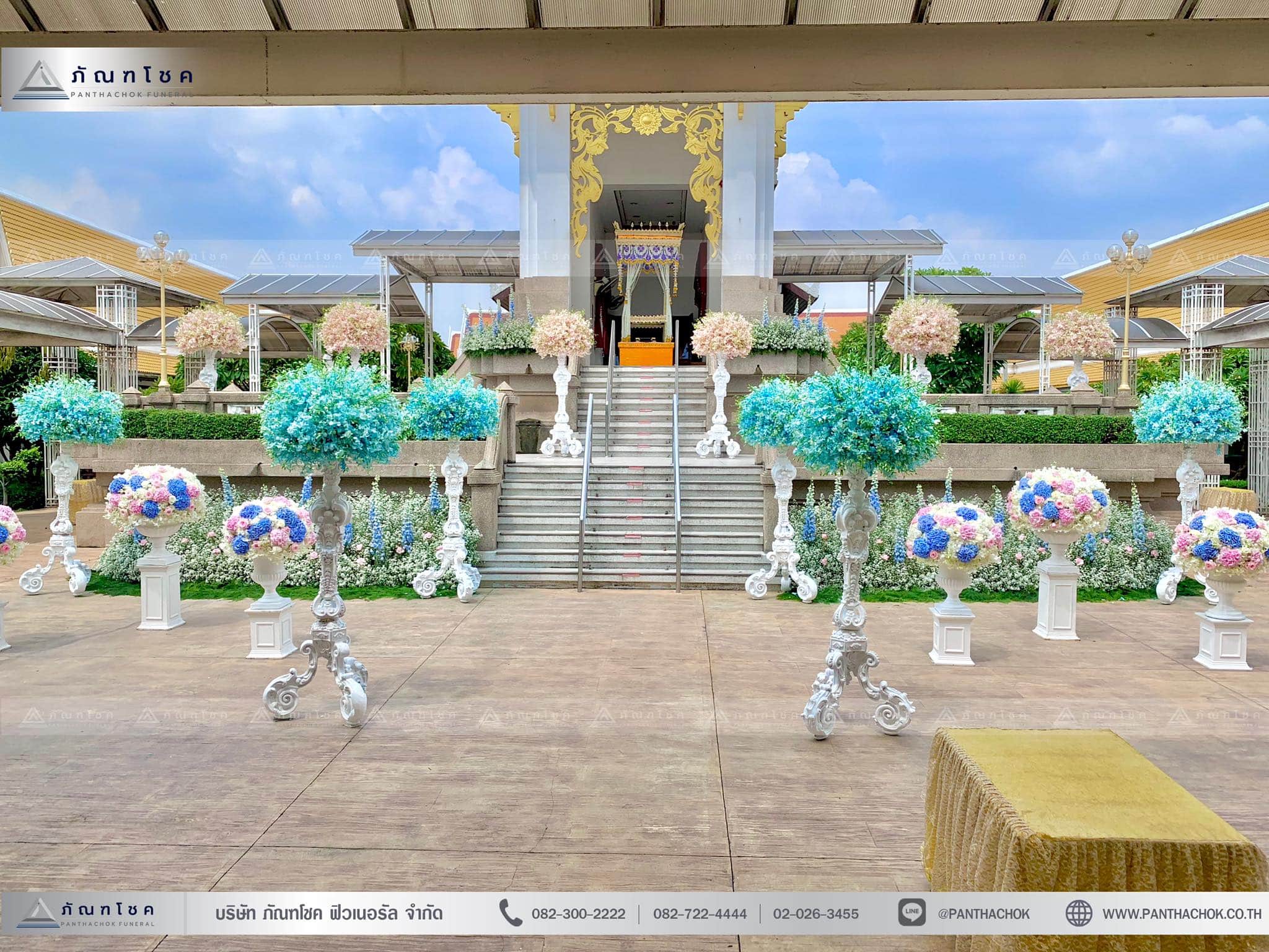 ดอกไม้หน้าเมรุหลากหลายสี ทำให้รู้สึกถึงความหรูหรา ในรูปแบบพุ่มดอกไม้ ที่ล้อมรอบเมรุที่สวยงาม