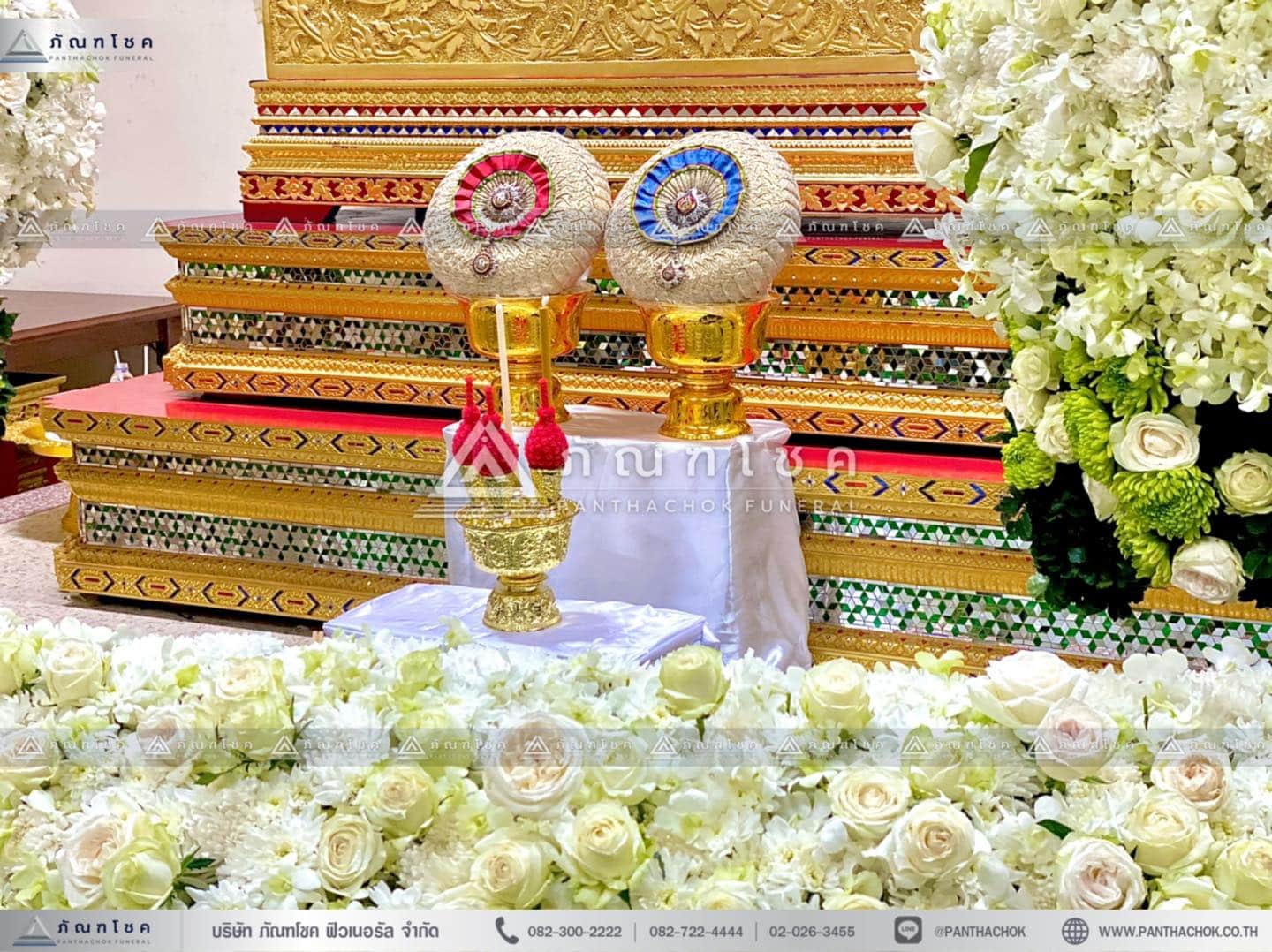 พุ่มดอกไม้สีขาวบริสุทธิ์ ตกแต่งด้วยดอกไม้โทนสีขาวนานาพันธุ์ และเป็นดอกไม้ที่มีความหมายอันดี อาทิ ดอกกล้วยไม้ตัวแทนความสง่างามที่อ่อนโยน ดอกมัมมาเลเซีย สื่อถึงความจริงใจ และดอกกุหลาบหอมสีขาว ยังมีดอกไม้อีกหลายชนิดที่ไม่ได้กล่าวถึง ซึ่งดอกไม้สดที่นำมาจัดแต่งหน้าศพนั้นเป็นดอกไม้นอก ดอกโต สีสันสวยงาม คัดสรรมาอย่างดี เพื่อให้ออกมาเป็นชุดดอกไม้หน้าศพสวยหรู สง่างาม สมบูรณ์แบบ เปล่งประกายความสวยงามตลอดพิธีศพ เมื่อรวมเข้ากับหญ้าเทียมสีเขียวขจี และกลิ่นหอมอบอวลของดอกไม้ที่ช่วยสร้างบรรยากาศให้งานศพสดชื่น ผ่อนคลายได้เป็นอย่างดี