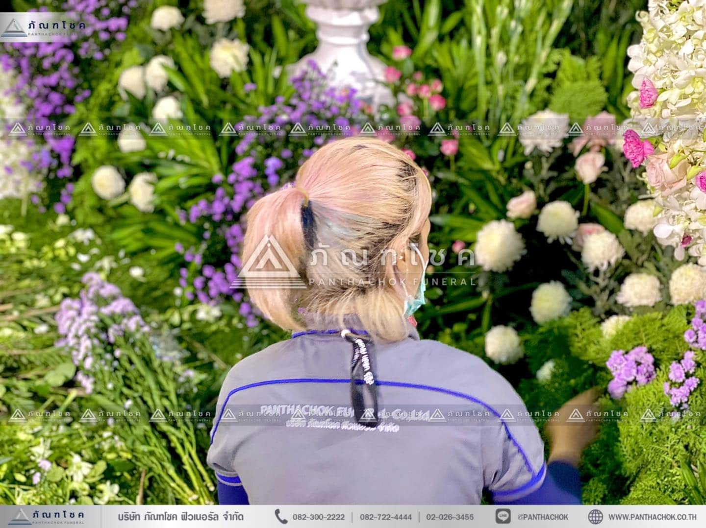 ประดับตกแต่งกรอบรูปหน้าศพอย่างอลังการ หรูหราด้วยดอกกุหลาบหอมอังกฤษสีชมพูดอกโต และแซมด้วยดอกหน้าวัวขนาดใหญ่สีชมพูอ่อนสลับสีเข้ม เพื่อให้ดอกไม้หน้ากรอบรูปมีมิติสมจริงมากขึ้นทางทีมงานทำการเพิ่มดอกกล้วยไม้สีขาวไล่ระดับดอกไม้กรอบรูปยาวลงมาอย่างนุ่มนวล รับกับสวนหน้าศพที่ได้รับแรงบรรดาลใจจากความงดงามของธรรมชาติ นำมาซึ่งผลงานดอกไม้สดชุดนี้ที่ผสมผสานความโมเดิร์นร่วมสมัย เข้ากับความสง่างามของนกยูง และตอบโจทย์ความต้องการของลูกค้าได้อย่างลงตัว
