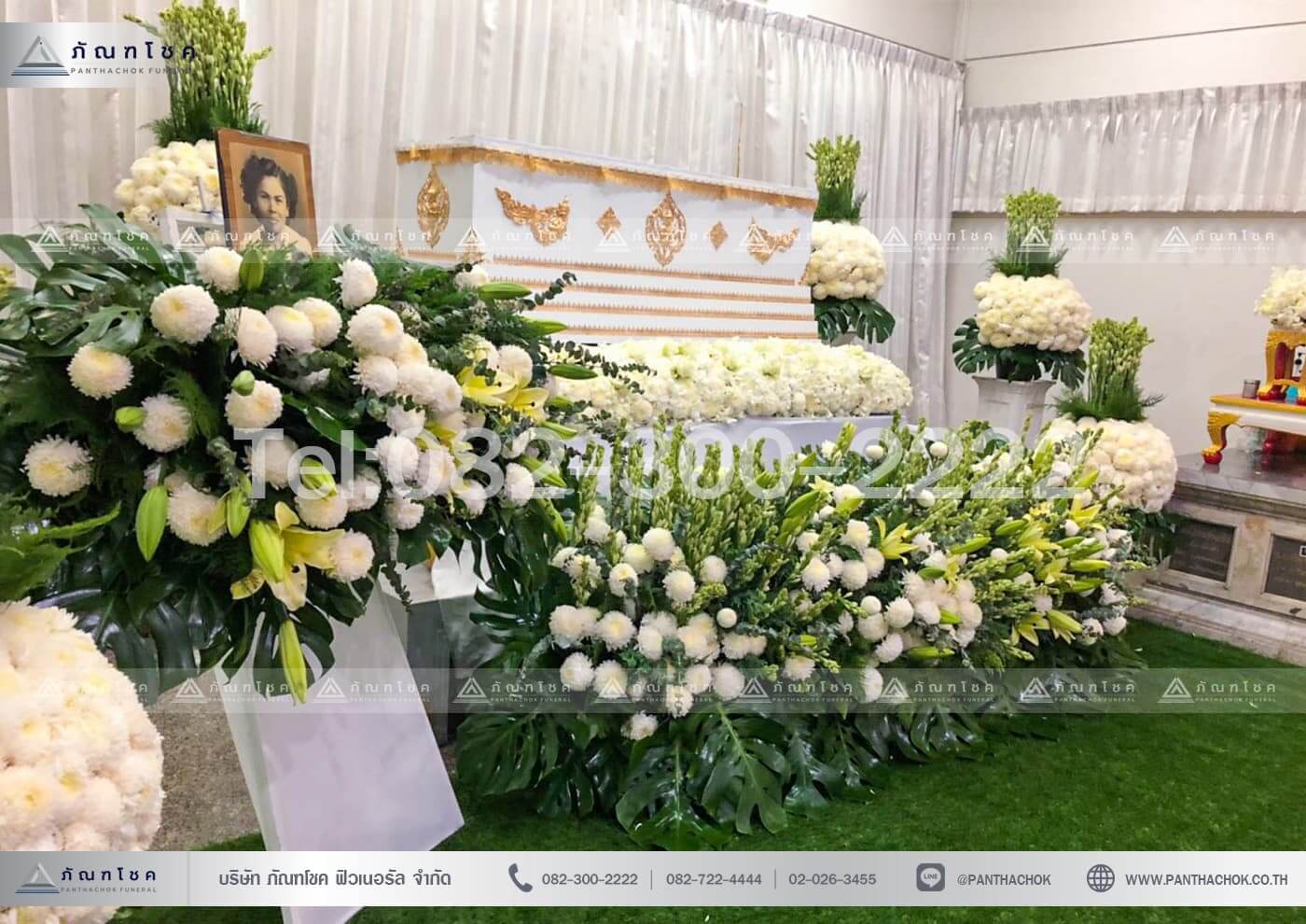 สวนดอกไม้งานศพ ดอกไม้แบบราง รางแบบสวน รางดอกไม้หน้าหีบ ดอกไม้หน้าหีบแบบราง จัดออกมาอย่างสวยงามเสมือนกับป่าสวน ดูเป็นธรรมชาติในโทนสีขาวเขียวจกแต่งด้วยดอกไม้จากต่างประเทศ ตกแต่งด้วยดอกเบญจมาศสีขาว ดอกปิงปองสวยงาม ดอกซ่อนกลิ่นตกแต่งแซมสสวยงาม ดอกลิลลี่ที่เพิ่มความหรูหราของรางได้เป็นอย่างดี