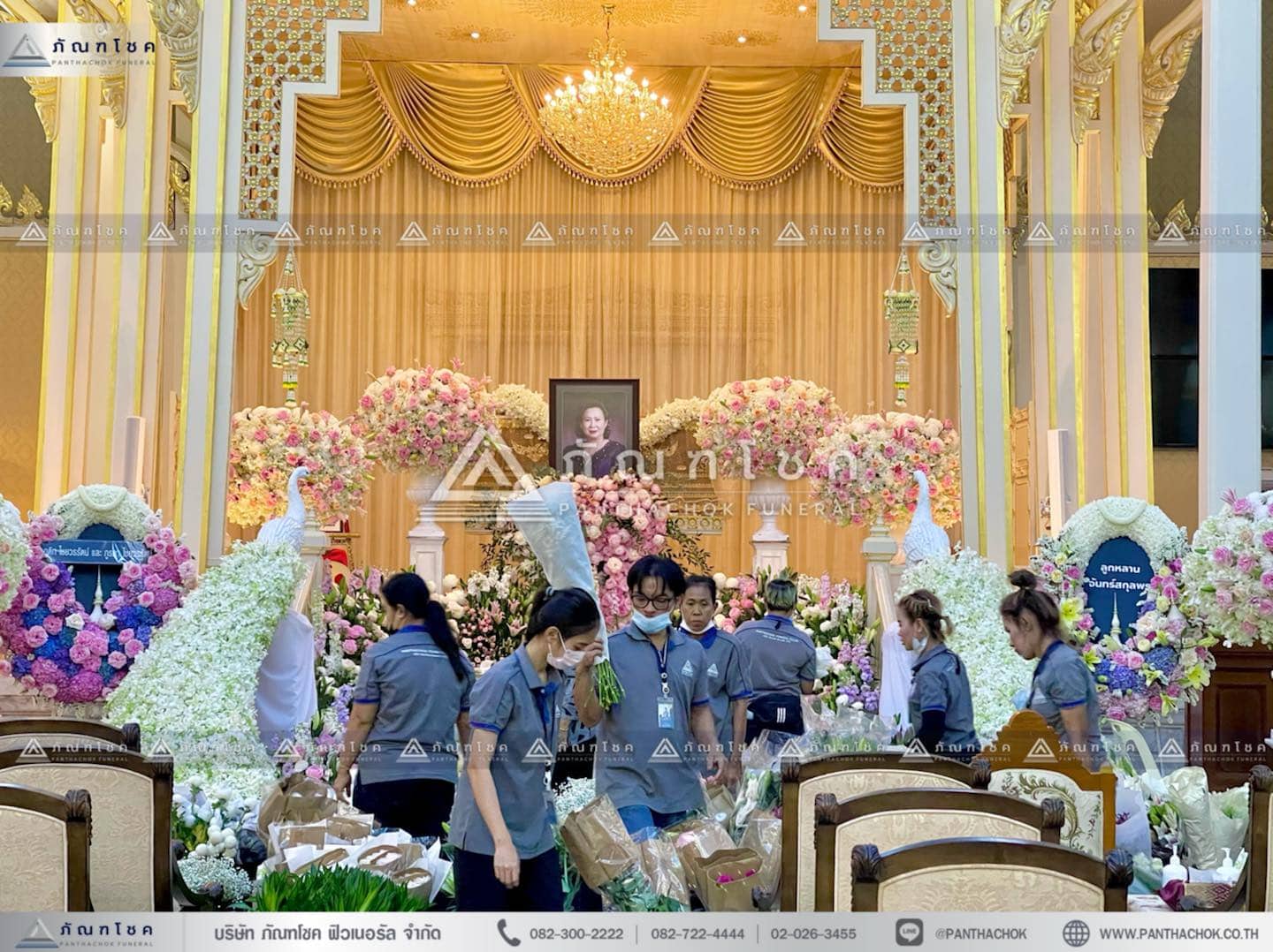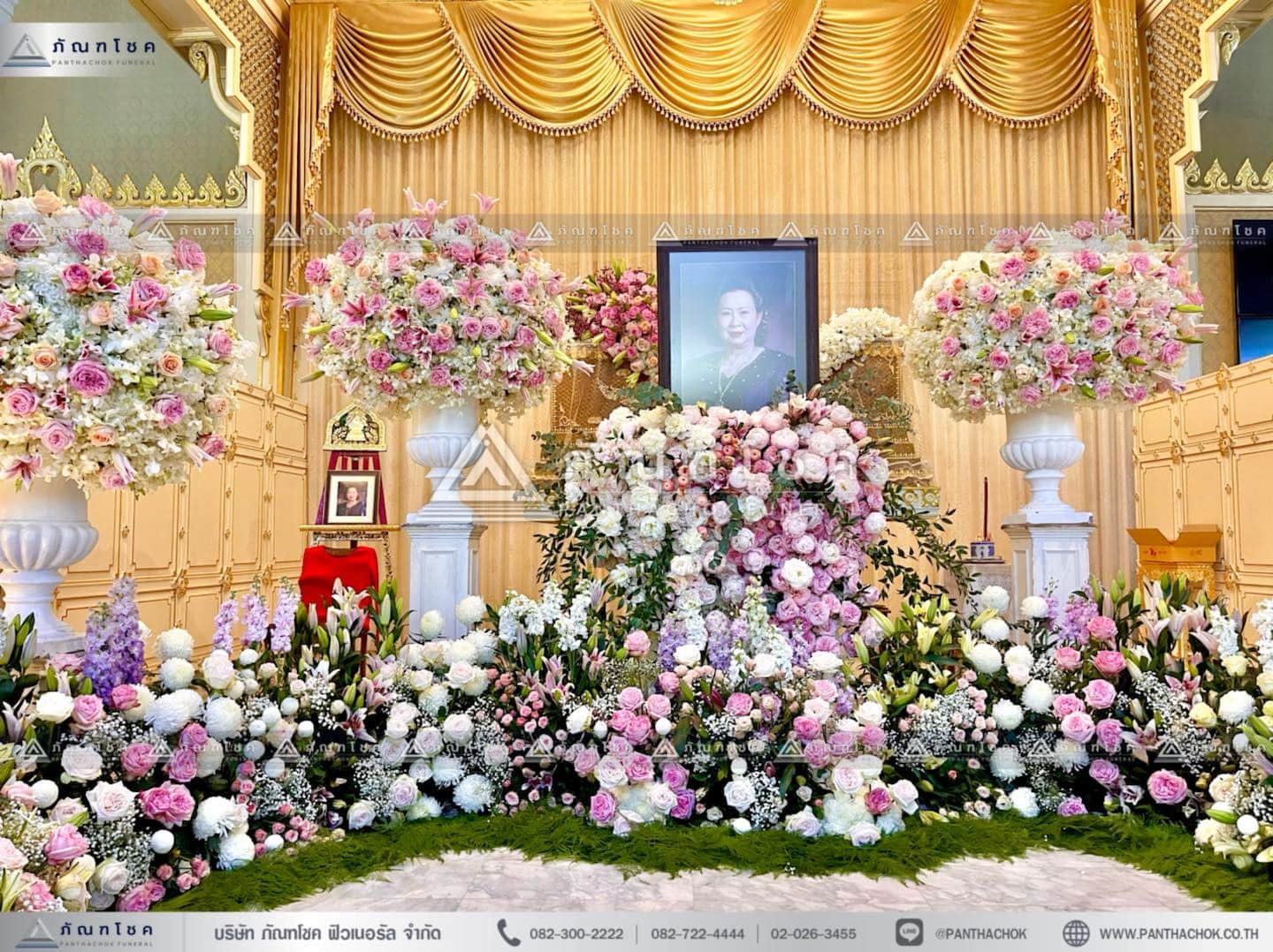 ดอกไม้หน้าศพสั่งทำพิเศษ ดอกไม้งานศพสีชมพู ดอกไม้หน้าหีบหรูหราประดับนกยูงสีขาว สวยหรู นกยูงดอกกล้วยไม้สดสวยๆ พร้อมสวนดอกไม้หน้าศพ ณ วัดสระเกศราชวรมหาวิหาร ( วัดภูเขาทอง ) เขตป้อมปราบศัตรูพ่าย กรุงเทพมหานคร ประดับตกแต่งดอกไม้อย่างหรูหรา อลังการ ด้วยดอกไม้ชั้น ดอกไม้หน้ากรอบรูประดับพรีเมียร์ทำให้กรอบรูปงานศพโดดเด่น สะดุดตามากยิ่งขึ้น ด้านข้างตกแต่งด้วยพุ่มกลมดอกไม้สดขนาดใหญ่ 6 พุ่ม ด้านหน้าบันไดทางขึ้นตกแต่งด้วยสวนดอกไม้ขนาดย่อม และสิ่งที่ขนาดไม่ได้เลยคือ พญานกยูงประดับดอกกล้วยไม้สดขนาดใหญ่ขนาบข้างบันไดทั้ง 2 ฝั่ง ดอกไม้หน้าศพทันสมัย สวยหรู มีระดับ พร้อมสวนสวยๆหน้าศพ ที่ส่งกลิ่นหอมอ่อนๆ ของดอกไม้ชั้นนำนานาชนิดที่ ภัณฑโชค คัดเลือกมาเป็นอย่างดี ดอกไม้งานศพสวยๆ