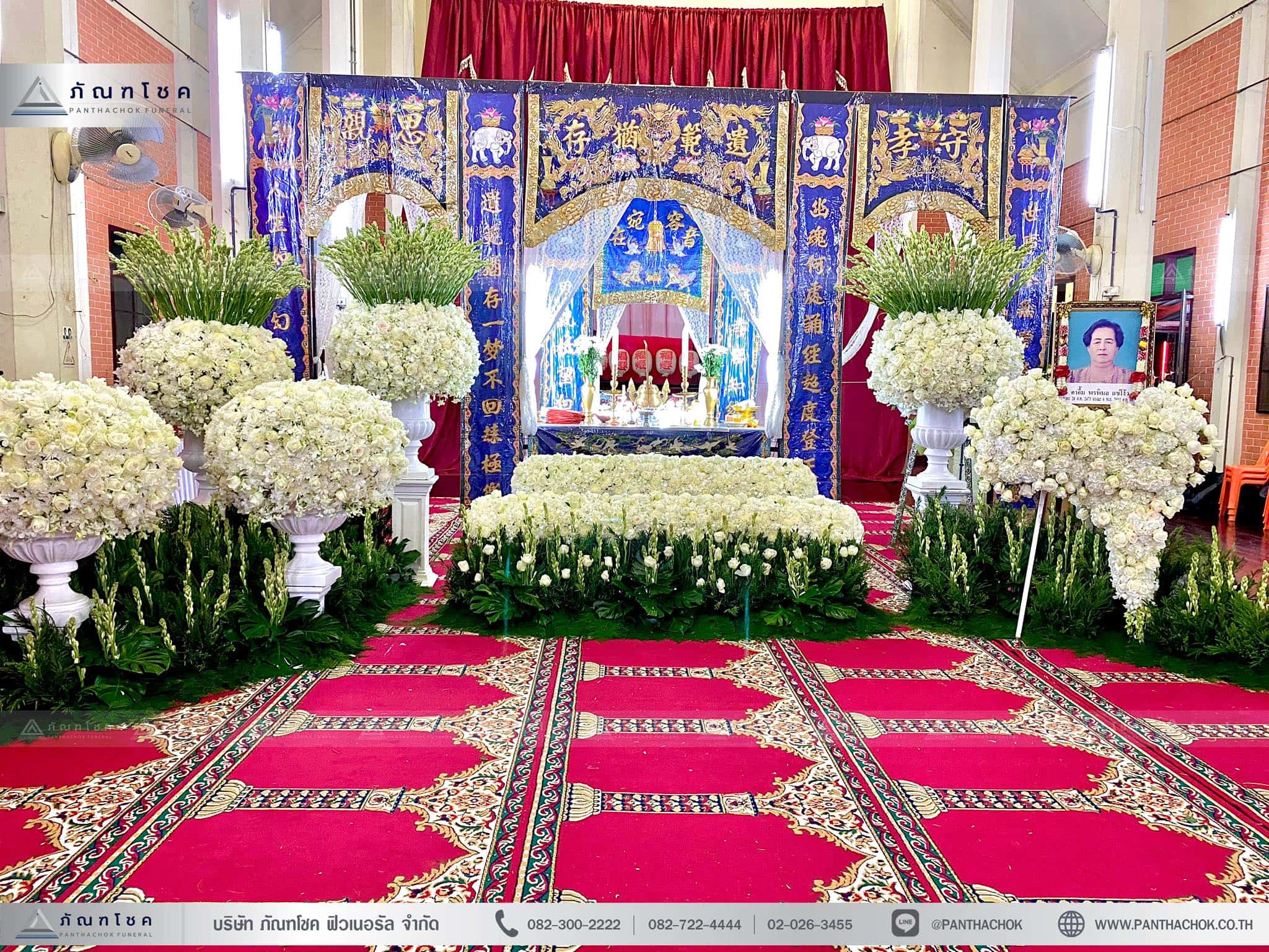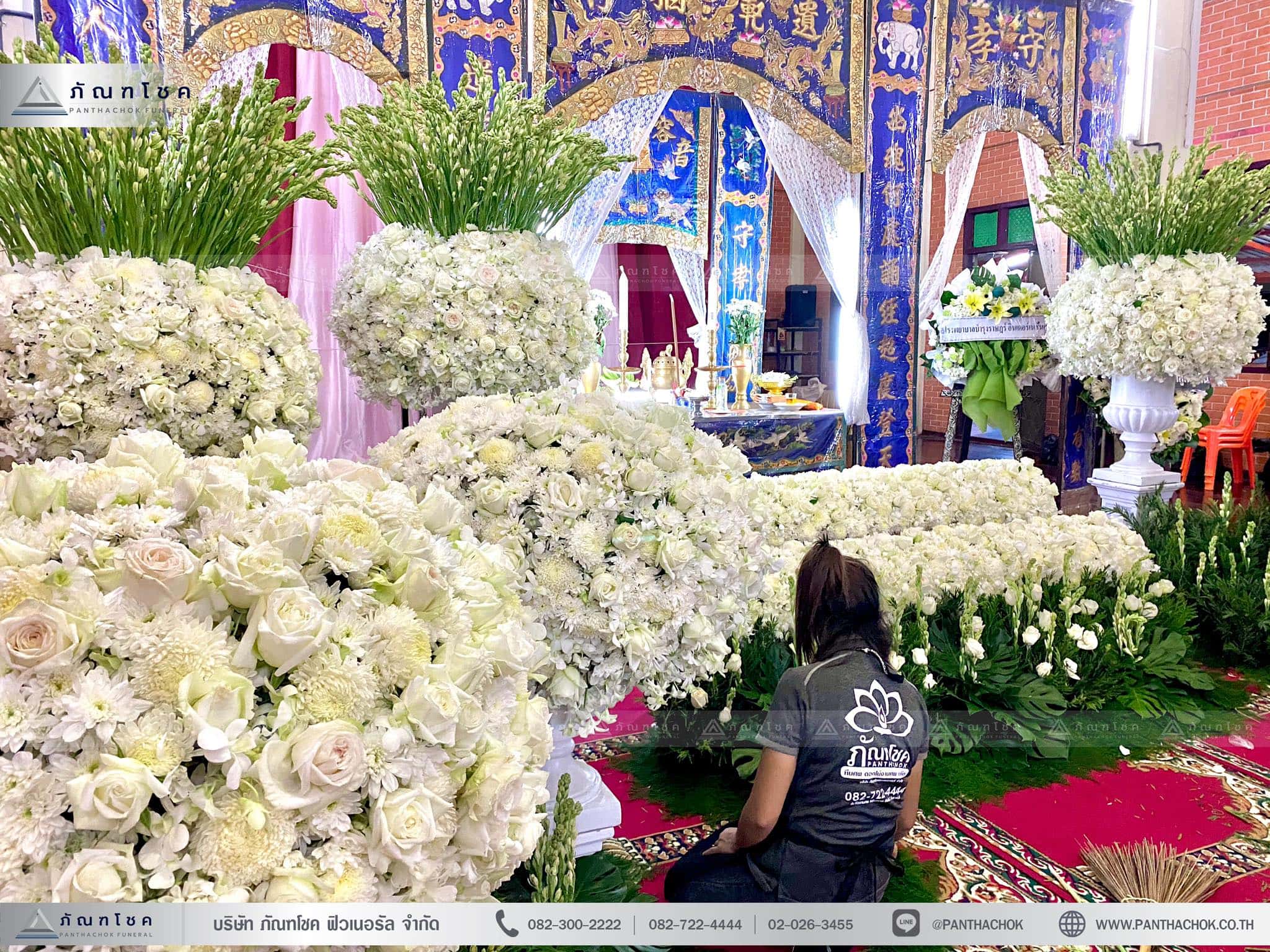 ดอกไม้งานศพโทนสีขาว และดอกไม้หน้าหีบสีขาว ประดับตกแต่งด้วยดอกไม้นำเข้าจากต่างประเทศ พุ่มกระถางโรมันสีขาว แซมดอกกุหลาบสีขาว พร้อมกับกอดอกซ่อนกลิ่น ซึ่งในแต่ละกระถางเราปักตามเลขมงคลของจีน ตกแต่งได้อย่างสวยงาม ผลงานจากช่างดอกไม้ฝีมือเยี่ยม ที่ผ่านการอบรมจาก “ภัณฑโชค ฟิวเนอรัล” ผลงานทุกงานเราจัดเอง ไม่ส่งงานต่อ เพื่อควบคุมคุณภาพและส่งมอบบริการอย่างดีที่สุด